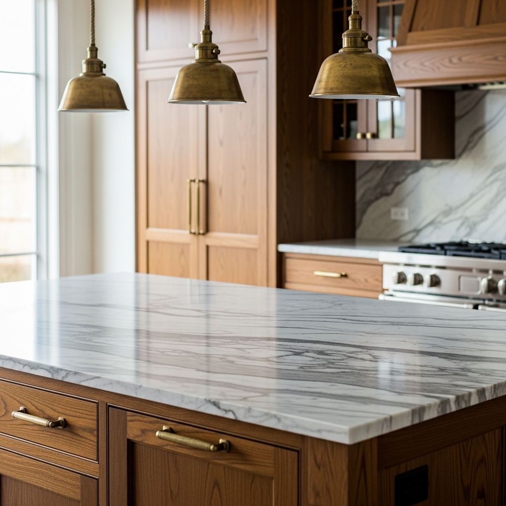 "A 1987 Colonial kitchen that was functional but sterile — all-white builder cabinets, dated granite, and a peninsula that blocked the family room connection."